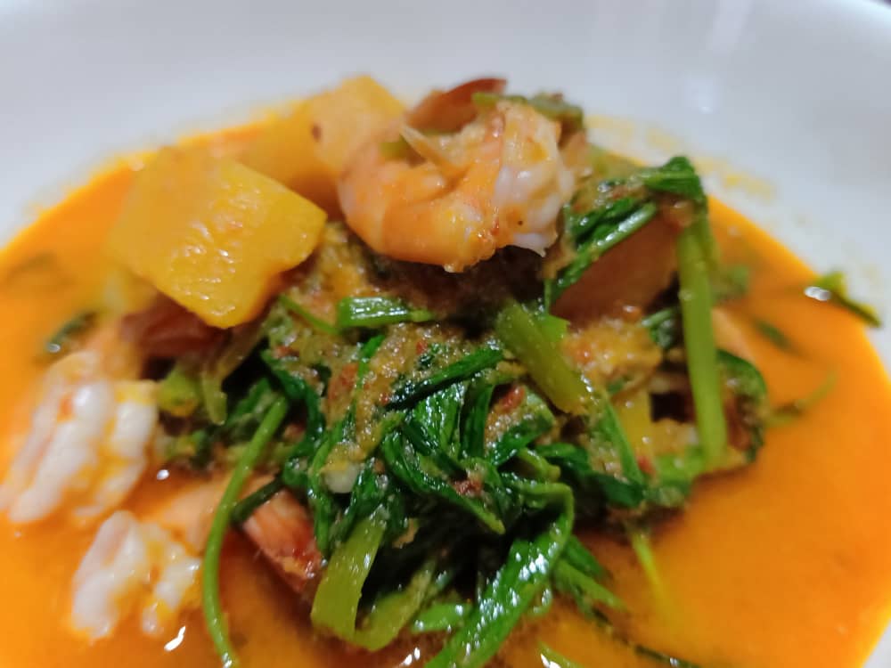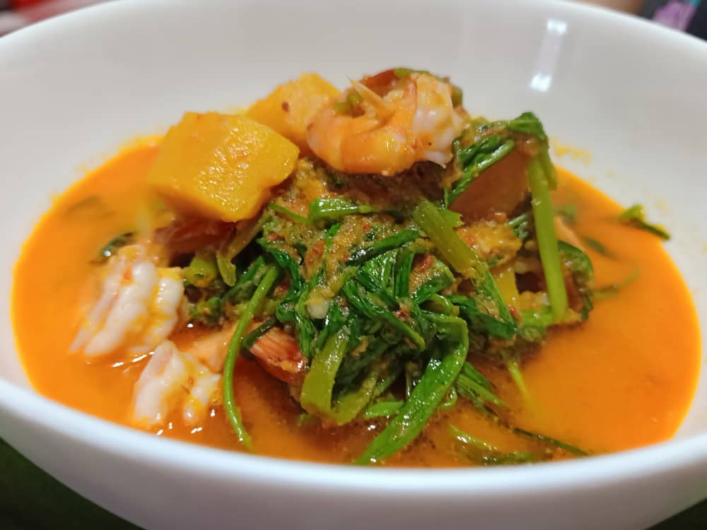 Add prawns and fry until they change colour. Pour in coconut milk and sweet potatoes.